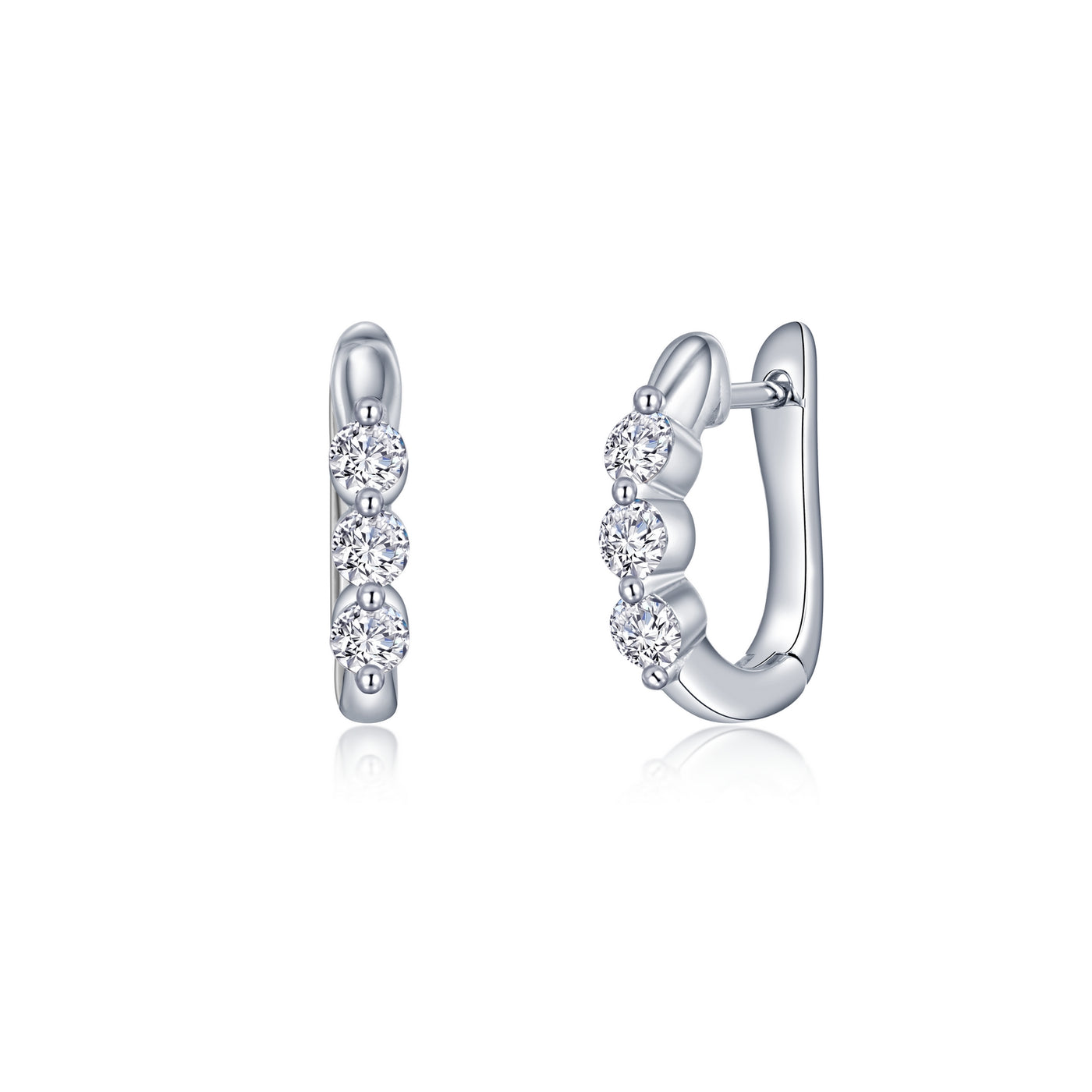 Cute and dainty. These three-stone huggie hoop earrings are set with Lafonn's signature Lassaire clear simulated diamonds in sterling silver bonded with platinum.